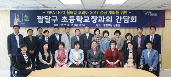 경기 수원시 팔달구는 지난 15일 구청 상황실에서 FIFA U-20 월드컵 코리아 2017의 성공 개최를 위한 지역내 15개 초등학교장과의 간담회를 개최했다. 사진은 김창범 구청장 및 교장들이 기념촬영을 하는 모습.(사진제공=팔달구청)