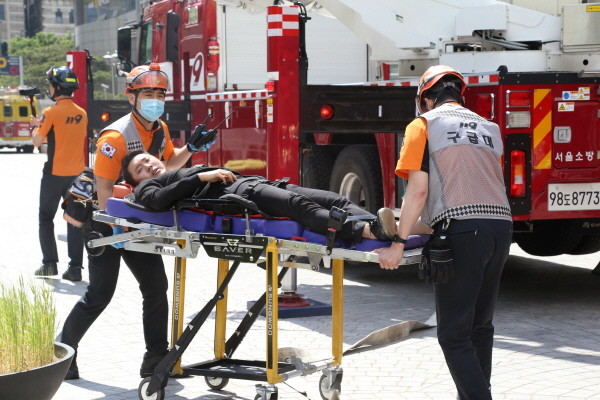 서울 강남소방서는 지난 15일 오전 코엑스 일대에서 강남구청, 강남경찰서 등과 함께 적 폭격도발을 가상한 민·관·군 합동훈련을 실시했다. 사진은 부상자 응급구조 훈련이 진행 중인 모습.(사진제공=강남소방서)