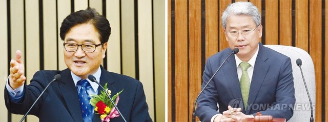 더불어민주당 새 원내대표로 선출된 우원식 신임 원내대표가 16일 오전 서울 여의도 국회에서 당선 소감을 말하고 있다(왼쪽). 국민의당 김동철 신임 원내대표(오른쪽 두번째)도 16일 오전 국회 본청에서 열린 의원총회에서 새 원내대표로 선출된 뒤 소감을 말하고 있다.