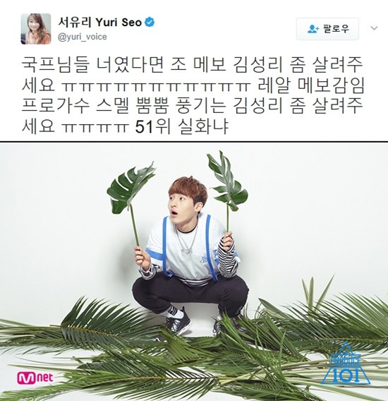 최근 서유리는 자신의 SNS에 “국프님들 너였다면 조 메보 김성리 좀 살려주세요ㅠㅠ 메보감임 프로가수 스멜 뿜뿜 풍기는 김성리 좀 살려주세요ㅠㅠ51위 실화냐”라는 글을 게재했다.