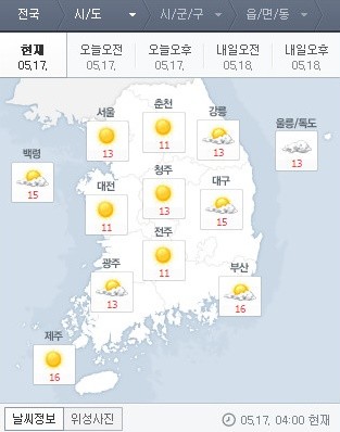 기상청은 오늘 17일 남해상에 위치한 고기압의 영향으로 전국이 대체로 맑을 것으로 예보했다.
