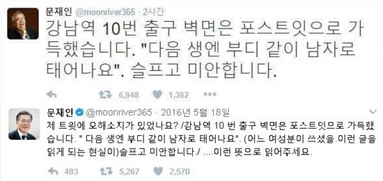 문 대통령은 강남역 묻지마 살인사건 당시 트위터를 통해 "강남역 10번 출구 벽면은 포스트잇으로 가득했습니다."다음 생엔 부디 같이 남자로 태어나요" 슬프고 미안합니다."라는 글을 게재했다.