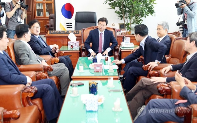 17일 오전 서울 여의도 국회에서 정보위원회 전체회의를 앞두고 열린 티타임에서 이철우 정보위원장(가운데)과 더불어민주당 우원식·국민의당 김동철 원내대표 등 위원들이 대화를 하고 있다. 정보위는 서훈 국가정보원장 후보자에 대한 인사청문회를 오는 29∼30일 열기로 결정했다.