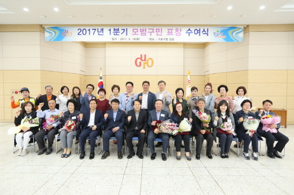 지난 16일 서울 구로구가 구청 강당에서 2017년 1분기 모범구민 표창 수여식을 개최했다. 사진은 행사에 참석한 이성 구청장(앞줄 가운데) 및 모범구민 표창 대상자들이 기념촬영을 하는 모습.(사진제공=구로구청)