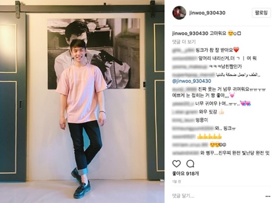 김진우는 팬들의 선물에 바로 연분홍 빛 후원 티셔츠와 희망 나눔 팔찌를 착용한 인증샷을 공개했다.