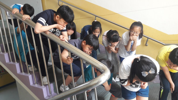 경기 부천시 부인초등학교에서는 지난 18일 병설유치원 어린이들과 1-6학년 학생들 그리고 모든 교직원이 참여한 가운데 화재 대피 훈련을 실시했다. 사진은 학생들이 입과 코를 막고 낮은 자세로 이동하는 모습.(사진제공=부천교육지원청)