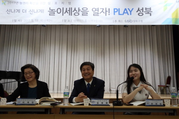 성북구가 아동·청소년의 놀권리 확산과 보장을 위한 심포지엄 '신나게, 더 신나게! 놀이세상을 열자! PLAY 성북'을 최근 개최한 가운데 김영배 성북구청장(가운데)이 석관고 우여민 학생(오른쪽)의 발언을 청취하고 있다.(사진제공=성북구청)