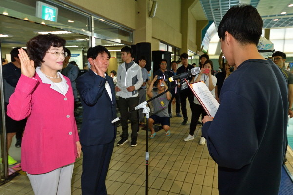 지난 21일 송파구 한국체육대학교에서 송파구체육대회·송파구수영연맹 주관으로 ‘제5회 송파구연맹회장기 수영대회’가 열렸다. 사진은 대회에 참석한 박춘희 구청장(왼쪽)이 대표자들로부터 선서를 받고 있는 모습.(사진제공=송파구청)