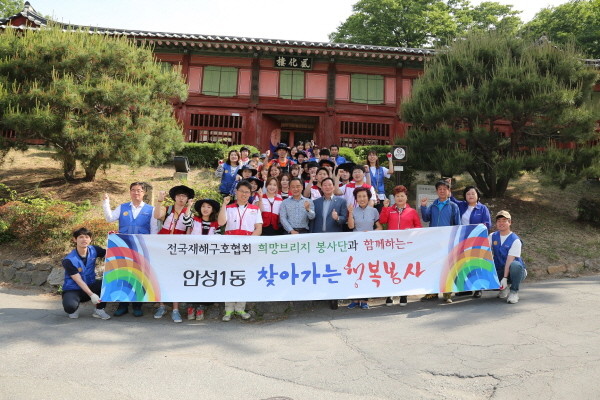 경기 안성시 안성1동 주민센터 직원들은 지난 20일 ‘전국재해구호협회 희망브리지 봉사단’과 함께 지역내 벽화 그리기 봉사활동을 실시했다. 사진은 벽화그리기가 끝난 후 황은성 시장 등 관계자들이 기념촬영을 하는 모습.(사진제공=안성시청)