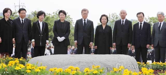 문재인 대통령이 23일 오후 경남 김해시 봉하마을 대통령 묘역에서 열린 노무현 전 대통령 8주기 추도식을 마친 뒤 묘역을 바라보고 있다.