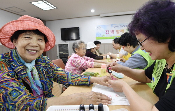 지난 23일 오전 10시 서울 광진구 군자동주민센터에서 ‘은둔 어르신 집 밖 함께 건강 프로그램’으로 네일아트를 진행한다. 사진은 자원봉사 캠프 봉사자가 프로그램에 참여한 노인에게 네일아트를 해주는 모습.(사진제공=광진구청)