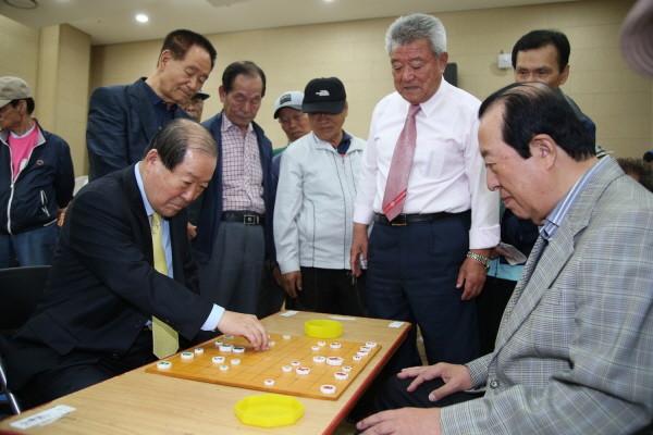 지난 23일 서울 마포구 용강동 복합청사 4층 강당에서 열린 '대한노인회 마포구지회장배 장기대회'에 참석한 박홍섭 마포구청장(왼쪽)이 노인과 장기를 두고 있다.(사진제공=마포구청)