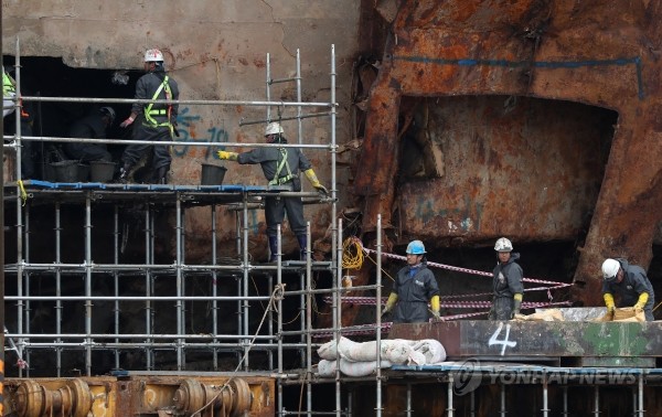 | ▲ 지난 24일 오전 전남 목포신항만 세월호 거치장소에서 선체수색 관계자들이 펄 제거 작업을 하고 있다.(사진제공=연합뉴스) | ||