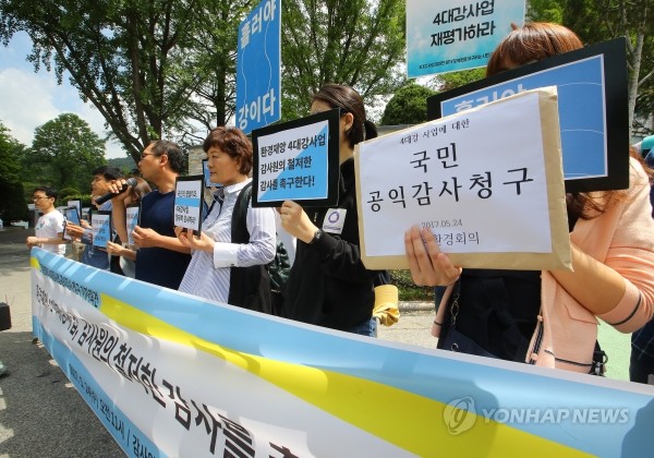 | ▲ 24일 오전 서울 종로구 북촌로 감사원 앞에서 한국환경회의 참가 단체 대표자들이 4대강 사업에 대한 공익감사 청구에 대한 기자회견을 하고 있다.(사진제공=연합뉴스) | ||
