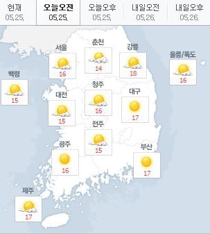 25일 서울 오전 16도, 춘천 14도, 대전 15도, 청주 16도, 대구 17도, 부산 17도, 제주 17도를 기록 중이다.