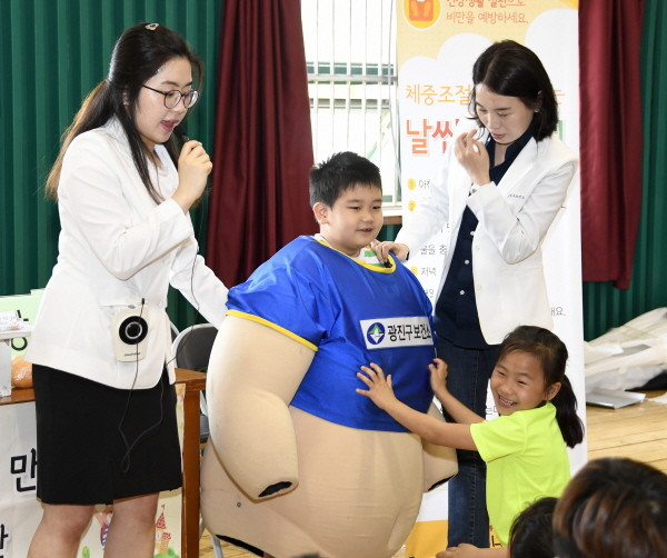 광진구는 지난 22일 서울장안초등학교 1~2학년 170여명을 대상으로 이동 건강체험·홍보관인 ‘건강한 학교만들기’를 운영했다. 사진은 ‘영양·비만관’에 참가한 학생이 비만조끼를 입고 가상비만체험에 참가한 모습.(사진제공=광진구청)
