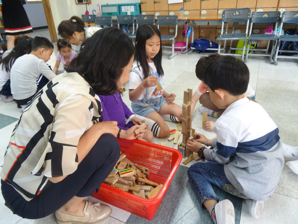 경기 부천시 석천초등학교에서는 지난 23일 1학년 학생 180명을 대상으로 '꿈과 끼를 펼치는! 꿈돋움 진로가족캠프'를 운영했다. 사진은 ‘위대한 건축가’ 코너에서 학생들이 젠가를 이용해 멋진 탑과 집을 만들어보는 모습.(사진제공=부천교육지원청)