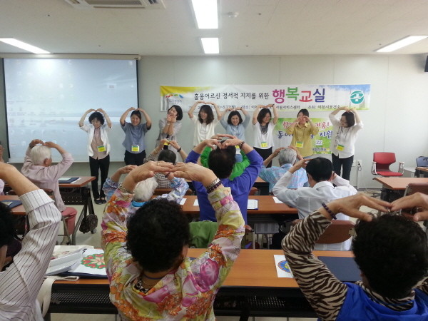 경기 이천시보건소는 지난 22일 홀몸노인의 우울감소 및 정신건강 증진을 위한 '행복교실' 수료식을 진행했다 . 사진은 보건소 관계자들이 노인들과 함께 하트 포즈를 취하며 소통하는 모습.(사진제공=이천시청)