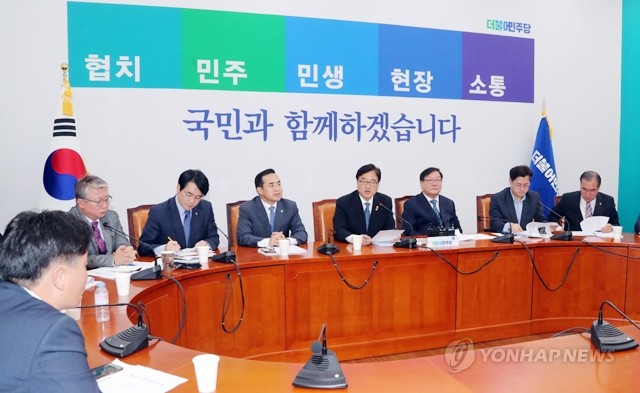 더불어민주당 우원식 원내대표가 25일 오전 국회에서 열린 정책조정회의에서 발언하고 있다. 우 원내대표는 새로운 배경판에 대해 “집권여당의 1기 원내대표단의 5대 키워드인 ‘협치,민주,민생,현장,소통’을 중심으로 ‘국민과 함께하겠습니다’란 의미”라며 “하얀 바탕을 크게 해 우리나라를 새로운 바탕 위에 새로운 대한민국 만들겠다. 나라를 나라답게 만들겠다. 문재인 정부가 새로운 대한민국을 백지 위에서 잘 건설하겠다는 뜻”이라고 밝혔다.