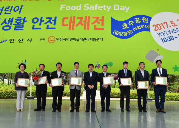 경기 안산시는 지난 24일 호수공원에서 지역내 어린이집 및 유치원 원아, 학부모 등 2400여명이 참여한 가운데 ‘제16회 식품안전의 날 기념 어린이식생활안전 대제전’을 개최했다. 사진은 제종길 시장(가운데)이 식품유공자에 대한 표창식에서 유공자들과 함께 기념촬영 하고 있는 모습.(사진제공=안산시청)