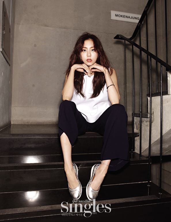 사진 속 유이는 화이트 컬러 슬리브리스에 짙은 블루컬러 와이드 팬츠를 입고 계단위에 앉아 카메라를 정면으로 바라보고 있다.