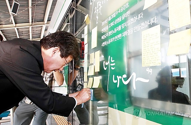 바른정당 유승민 의원이 지하철 2호선 구의역 스크린 도어 사고 1주기를 맞아 28일 오전 서울 광진구 구의역 강변역 방면 9-4 승강장 앞에서 헌화, 묵념한 뒤 스크린 도어 옆에 추모 메시지를 부착하고 있다.