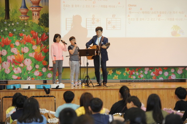 쎄시봉의 멤버인 가수 윤형주씨는 지난 26일 경기 오산시 필봉초등학교를 방문해 6학년 학생들을 대상으로 일일 통기타 선생님이 돼 수업을 진행했다. 사진은 윤씨의 통기타 반주에 맞춰 어린이들이 노래를 하는 모습.(사진제공=오산시청)