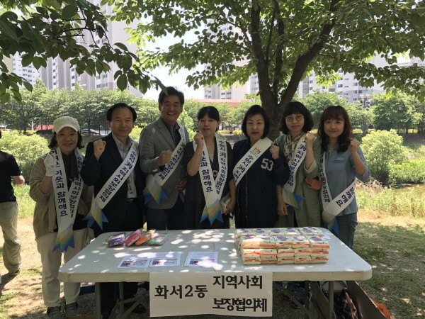 경기 수원시 팔달구 화서2동 지역사회보장협의체는 지난 27일 복지사각지대 발굴과 후원자 발굴을 위한 캠페인을 실시했다. 사진은 캠페인 참여자들이 기념촬영을 하는 모습.(사진제공=팔달구청)