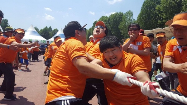 지난 27일 반포종합운동장에서 ‘2017 잠원·반포권역 서초구민체육대회’가 개최됐다. 사진은 대회에 참가한 주민들이 힘찬 목소리로 구호를 외치며 줄다리기 경기를 진행하고 있는 모습.(사진제공=서초구청)