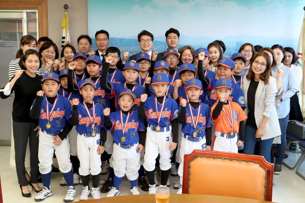 최근 서울 성동구 유소년야구단은 양구 구암리 야구장 등 7개 구장에서 열린 ‘국토정중앙 양구 전국유소년야구대회’에서 우승을 차지했으며, 팀의 김승주 선수는 최우수상, 임준수 선수는 우수선수상을 수상했다. 사진은 선수들이 기념촬영을 하는 모습.(사진제공=성동구청)