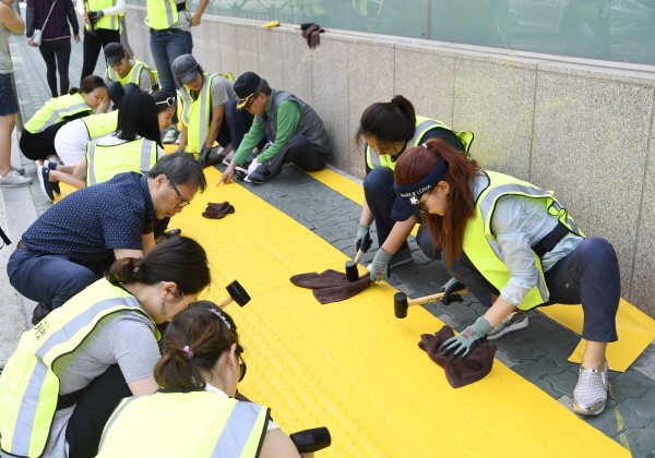 서울 광진구가 지난 29일 오전 세종·장안·양남 초등학교 앞 통학로에 학부모, 학생, 교사 등 30여명과 함께 ‘옐로카펫’을 깔았다. 사진은 세종초등학교 앞 통학로에 망치를 이용해 노란색 스티커를 부착하고 있는 세종초 녹색 어머니회 회원, 학부모, 학생, 교사들의 모습.(사진제공=광진구청)