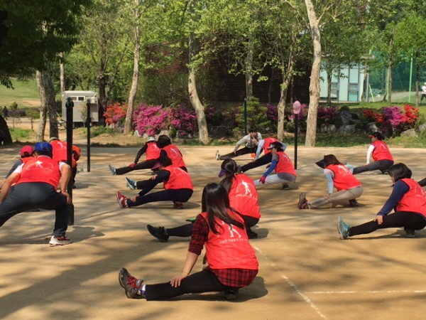 | ▲ 건강걷기 프로그램에 참여한 주민들이 몸풀기 운동을 하고 있다. | ||
