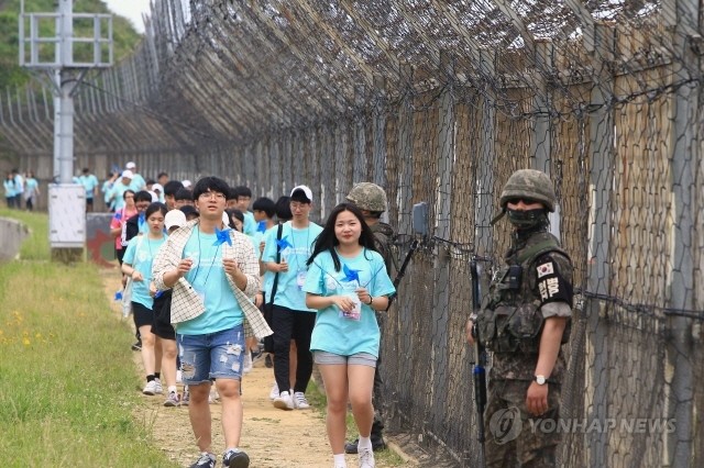 강원도교육청이 개최한 2017 세계평화교육 페스티벌 DMZ 평화행진에 참가한 청소년들이 30일 동해안 최북단 지역에서 철책선을 따라 걷고 있다. 이날 행진에는 일본과 중국, 러시아, 인도네시아, 필리핀, 카자흐스탄, 한국 등 7개국에서 중고교 학생과 교사 등 500여 명이 참가했다.