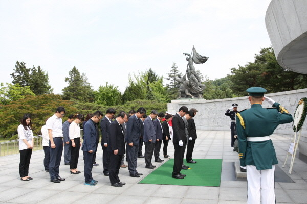 우정사업본부 서울지방우정청은 최근 제62회 현충일을 맞아 동작구에 위치한 국립서울현충원을 방문, 묘역 가꾸기 봉사활동을 실시했다. 사진은 국립서울현충원을 방문한 박종석 청장과 봉사단원들이 봉사활동 전, 순국선열의 묘역에 헌화하고 참배하고 있는 모습.(사진제공=서울지방우정청)