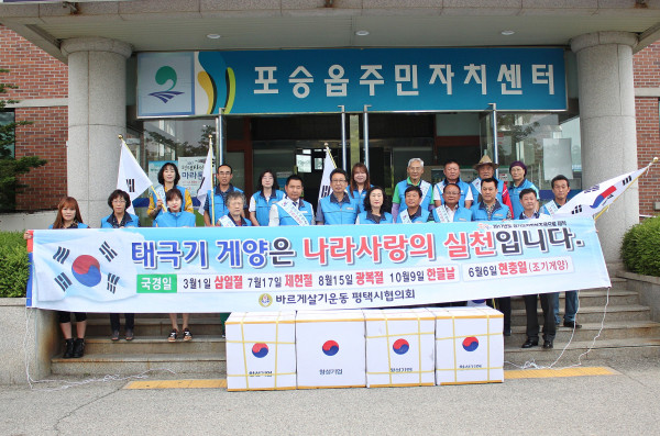 경기 평택시 포승읍 바르게살기위원회는 지난 31일 포승읍사무소에서 주민들과 회원 20명이 참여한 가운데 ‘태극기 달기 캠페인’ 행사를 실시했다. 사진은 행사에 참여한 관계자들이 기념촬영을 하는 모습.(사진제공=평택시청)