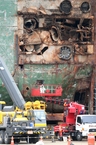 | ▲ 1일 오전 전남 목포신항만에 거치 된 세월호에서 작업자들이 수색 작업을 이어가고 있다.(사진제공=연합뉴스) | ||