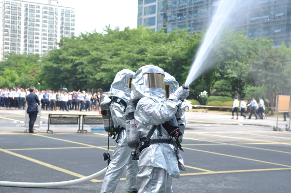 서울 구로소방서는 지난 1일 오전 11시 가산디지털단지에 소재 롯데정보통신에서 민·관합동 훈련을 실시했다. 사진은 소방공무원들이 종합방수 훈련을 진행 중인 모습.(사진제공=구로소방서)