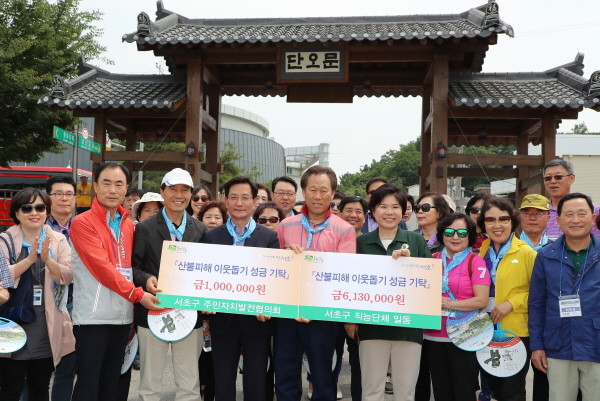 최근 조은희 서초구청장(앞줄 오른쪽 첫 번째)이 주민자치발전협의회 등 주민 64명과 함께 강릉을 방문해 서초구 8개 직능단체 회원들이 자발적으로 마련한 산불피해 이재민 돕기 성금 713만원을 최명희 강릉시장(앞줄 왼쪽 세 번째)에게 전달했다. 사진은 전달식 기념촬영 모습.(사진제공=서초구청)