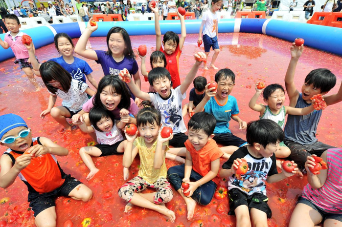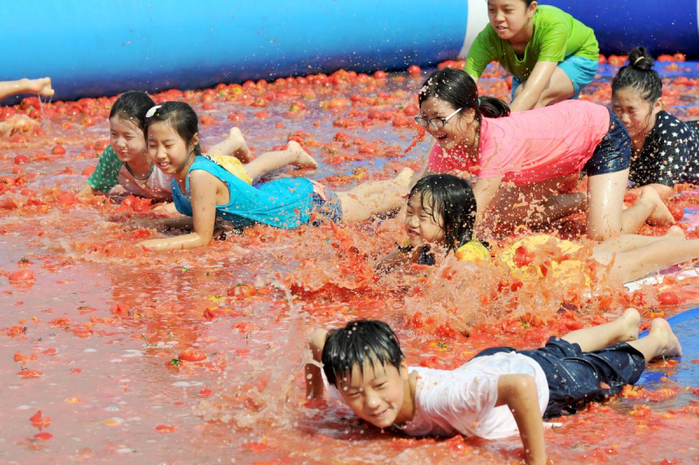 던지고 미끄러지며 뛰어노는 '토마토 풀장' 인기