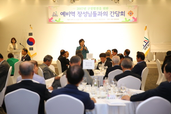 서초구가 지난 2일 호국보훈의 달을 맞아 반포동 팔레스호텔에서 지역내 예비역 장성 54명을 초청해 장성들의 경륜과 지혜를 듣는 간담회를 개최했다. 사진은 간담회에 참여한 조은희 구청장이 구정에 관한 이야기를 나누고 있는 모습.(사진제공=서초구청)