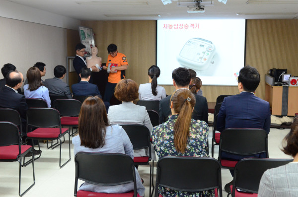 서울 영등포소방서는 지난 2일 오전 영등포동 소재 롯데백화점에서 직원들을 대상으로 소방안전교육을 실시했다. 사진은 자동심장충격기 사용법에 대한 교육이 진행 중인 모습.(사진제공=영등포소방서)