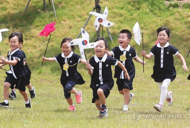 8일 오전 경기도 이천시 모가면 민주화운동 기념공원을 찾은 어린이들이 직접 만든 태극기 바람개비를 들고 힘차게 달리고 있다.
