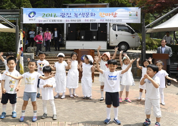 서울 광진구가 지난 8일 오전 10시30분부터 아차산 생태공원에서 21개 환경단체, 자원봉사자, 지역주민 등 600여 명이 참석한 가운데 ‘광진 녹색문화 한마당’을 개최했다. 사진은 어린이들이 환경의 날 기념 퍼포먼스 공연을 펼치고 있는 모습.(사진제공=광진구청)