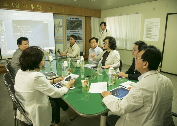 | ▲ 행정사무감사 기간 중 천호대로(광나루역) 확장공사 사업 현장을 방문한 광진구의원들이 관계자에게 사업 설명을 듣고 있다.(사진제공=광진구의회) | ||