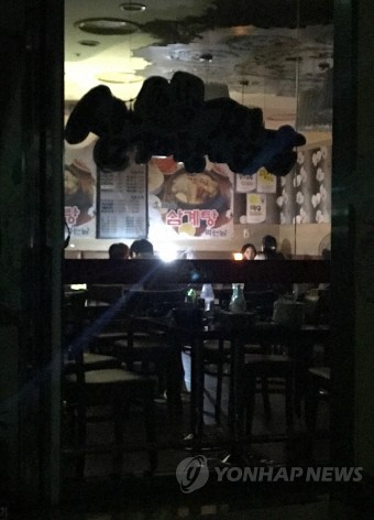 서울 서남부 일대와 광명시 등에 대규모 정전이 발생한 11일 오후 서울 신도림 테크노마트 내부에 비상등을 제외한 전등이 모두 꺼져 캄캄한 모습이다. 시민들이 어둠 속에서 식사하고 있다.