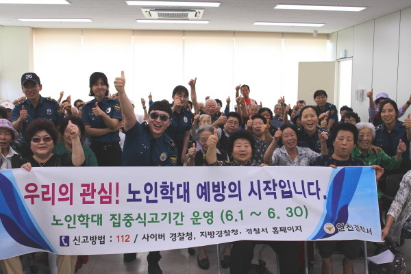 최근 경기 연천경찰서 여경봉사단인 ‘러브폴’은 ‘제1회 노인학대 예방의 날’을 맞이해 연천읍 소재 노인복지관을 방문해 ‘노인학대 관련 교육·홍보’를 실시했다. 사진은 교육에 참여한 경찰과 노인들이 기념촬영을 하는 모습.(사진제공=연천경찰서)