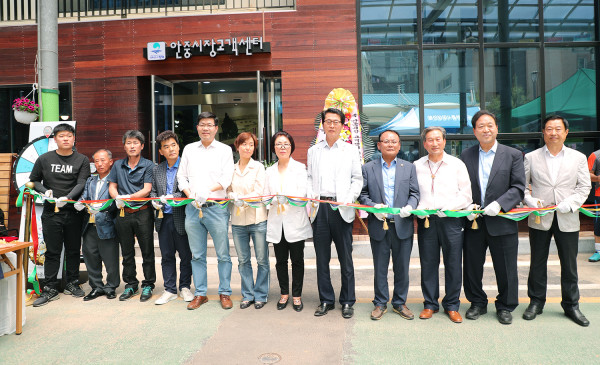 경기 평택시는 지난 11일 22억여원의 예산을 투입해 조성한 평택안중시장 고객센터와 야외쉼터의 준공식을 개최했다. 사진은 공재광 시장(왼쪽 다섯번째)과 시장상인 등 관계자들이 테이프커팅식에 참석한 모습.(사진제공=평택시청)