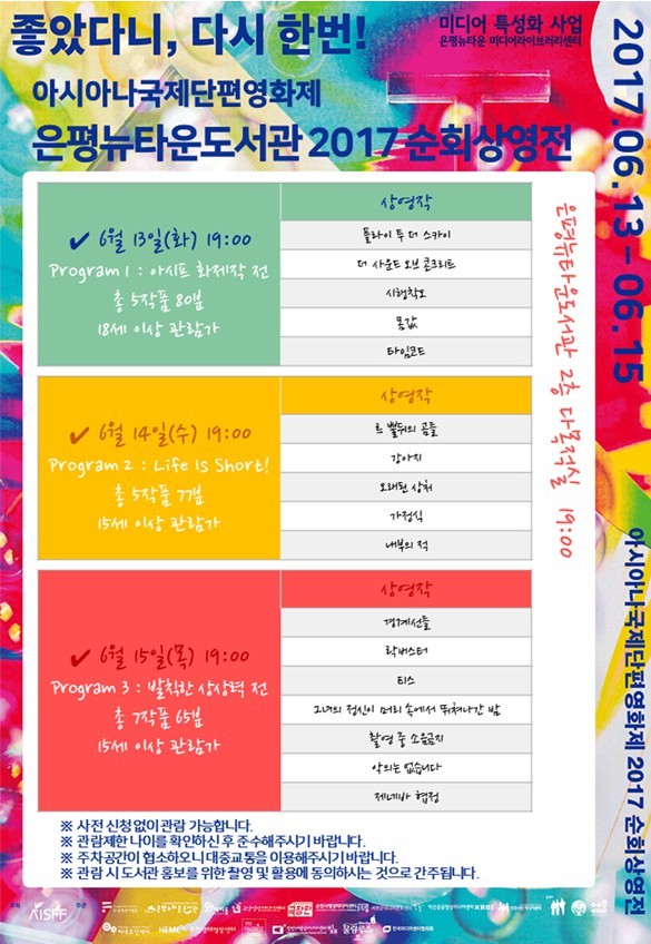 구립은평뉴타운도서관은 이외에도 2017 지역영상미디어센터 활성화 지원 상영지원사업의 일환으로 다양한 상영회 및 부대·교육프로그램을 운영할 예정이다.