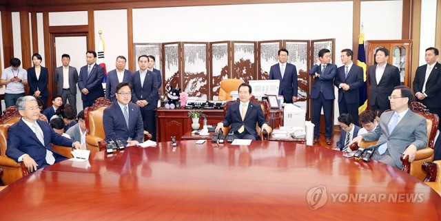 12일 오전 서울 여의도 국회에서 국회의장-4당 원내대표 정례회동이 열리고 있다. 왼쪽부터 국민의당 김동철·더불어민주당 우원식, 정세균 의장, 바른정당 주호영 원내대표. 자유한국당 정우택 원내대표는 불참했다.