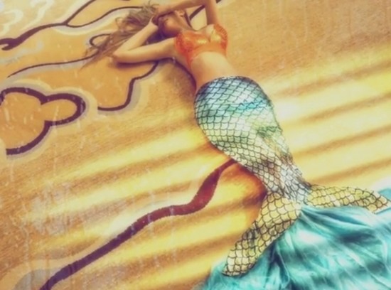 공개된 사진 속 그는 반짝거리는 인어의 꼬리 모양의 의상을 입고 있으며 손으로 얼굴을 가린 모습이다.